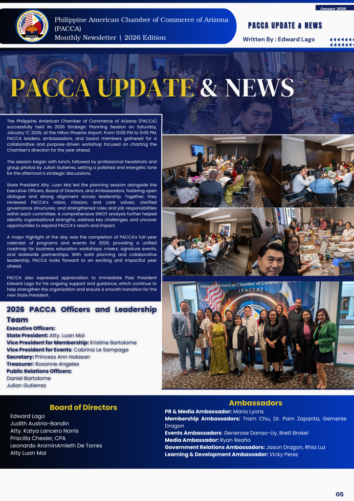 The Philippine American Chamber of Commerce of Arizona (PACCA) successfully held its 2026 Strategic Planning Session on Saturday, January 17, 2026, at the Hilton Phoenix Airport.