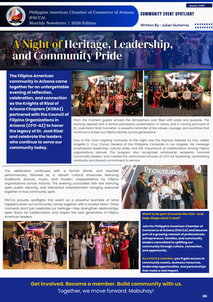 The Filipino American community in Arizona came together for an unforgettable evening of reflection, celebration, and connection as the Knights of Rizal of Arizona Chapters (KORAZ) partnered with the Council of Filipino Organizations in Arizona (CFO-AZ) to honor the legacy of Dr. José Rizal and celebrate the leaders who continue to serve our community today.