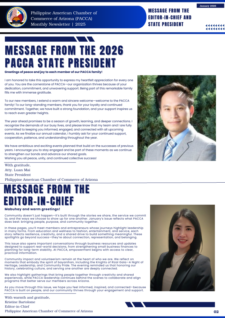 As we begin 2026, this edition of the PACCA Newsletter reflects what defines our organization most—community, collaboration, and shared purpose. Every story, milestone, and initiative featured in Volume 2 represents the collective efforts of members, partners, and leaders committed to strengthening the Filipino-American business community.