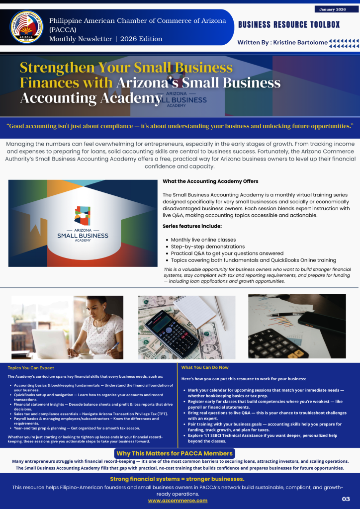 Managing the numbers can feel overwhelming for entrepreneurs, especially in the early stages of growth. From tracking income and expenses to preparing for loans, solid accounting skills are central to business success. Fortunately, the Arizona Commerce Authority’s Small Business Accounting Academy offers a free, practical way for Arizona business owners to level up their financial confidence and capacity.